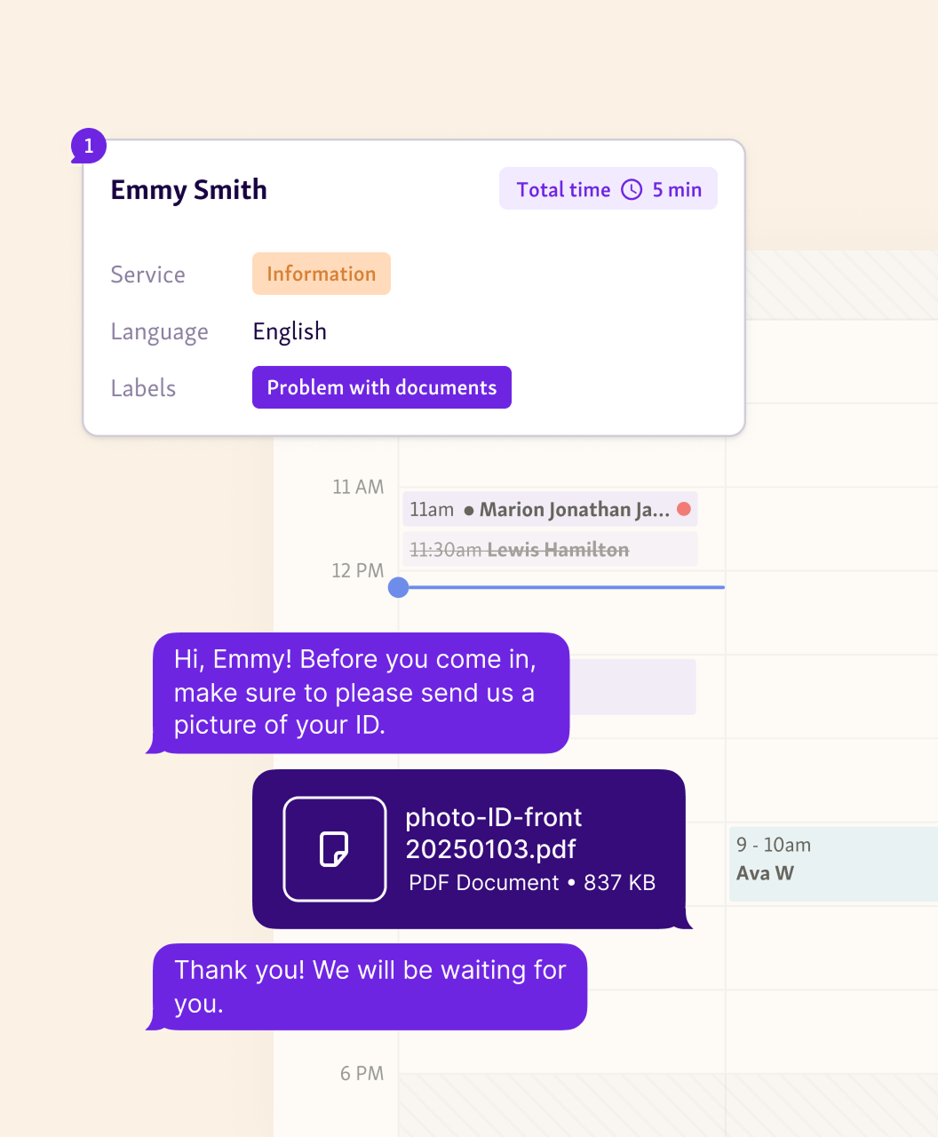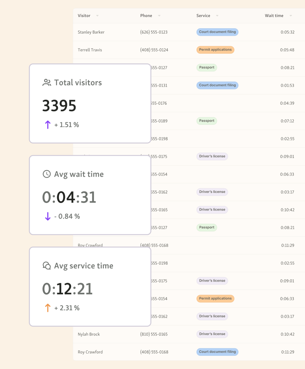 Qminder removes repetitive admin tasks like manually calling out names, tracking queues on paper, or updating spreadsheets. Clerks see all visitors and their service status at a glance and can message visitors directly.